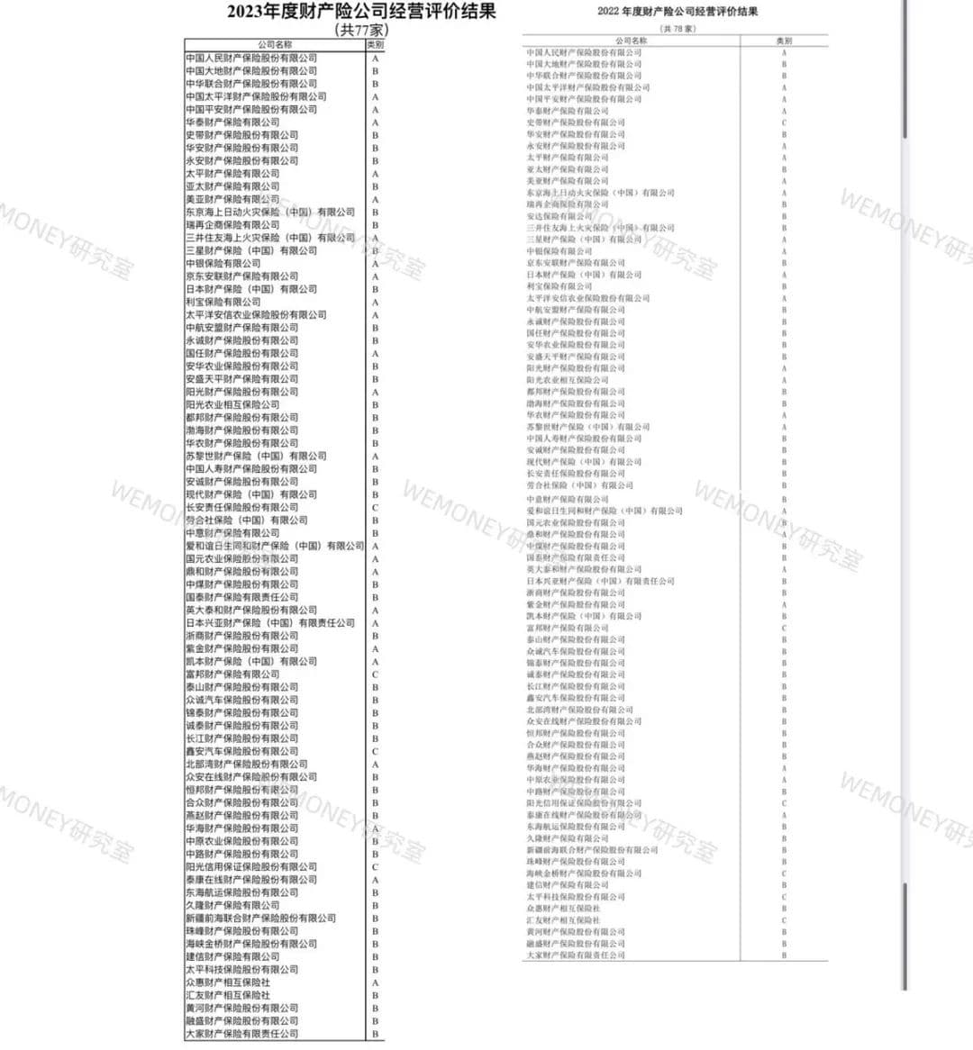 本次公告的保险公司共147家,其中财产险公司77家,人身险公司70家,评为A类、B类的险企总计占比超95%。据披露,评价内容包括速度规模、效益质量、社会贡献三个方面。从评价结果来看,财产险公司77家中,A类25家,B类48家,C类4家;人身险公司70家中,A类22家,B类45家,C类3家。