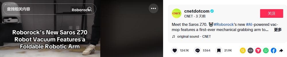 带手臂的扫地机器人在TikTok上引发讨论(图源:TikTok@cnetdotcom)