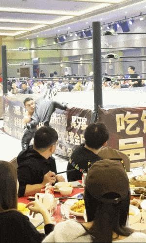 肌肉猛男抱着双马尾萌妹一顿猛摔,被倒挂在擂台围栏上萌妹被疯狂踹肚子,台下观众看得热血沸腾,欢呼之余手上的筷子也不忘往嘴里塞虾饺,服务员一副见怪不怪的样子在人群中穿梭。