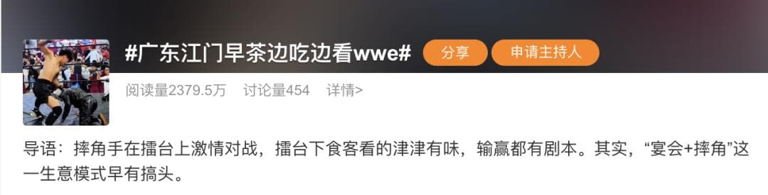 在早茶人均消费不过百的广州,早茶WWE定价堪比演唱会,即便如此,760个座位在两天内便售罄了。