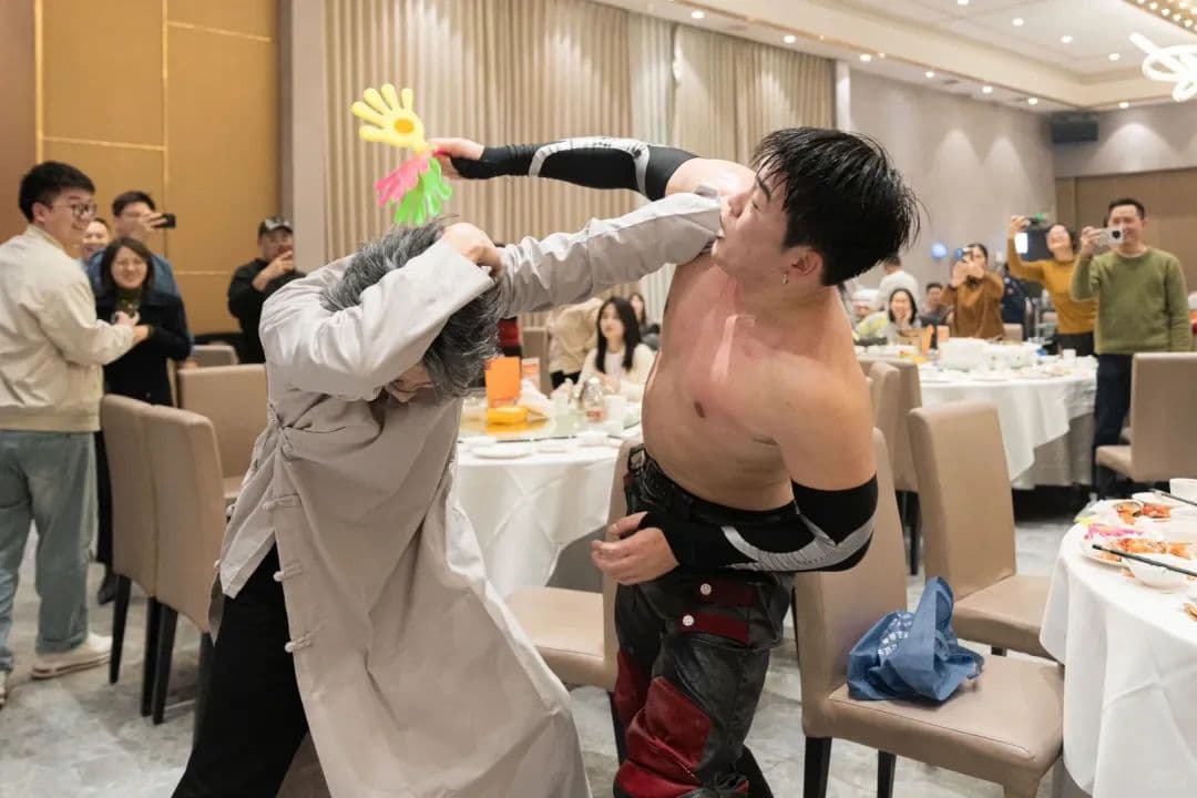 可别小瞧摔迷的热情,时隔5年,江门老板再次邀请「角斗之王」联盟来自己的生日宴表演。