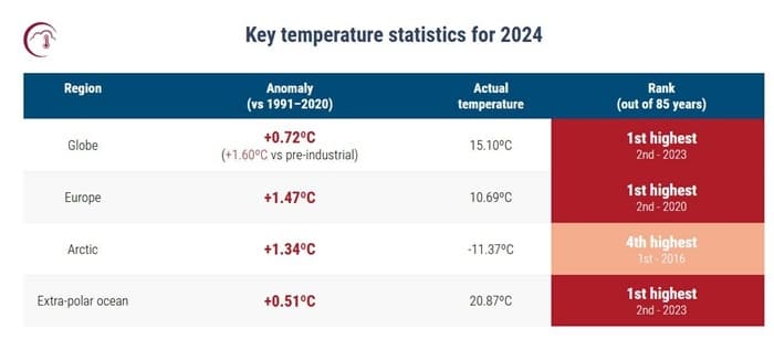 2024年成为了首个平均气温比工业化前水平高1.5摄氏度以上的年份。除此之外,2024年全年有多达11个月的月平均气温比工业化前水平高1.5摄氏度以上。