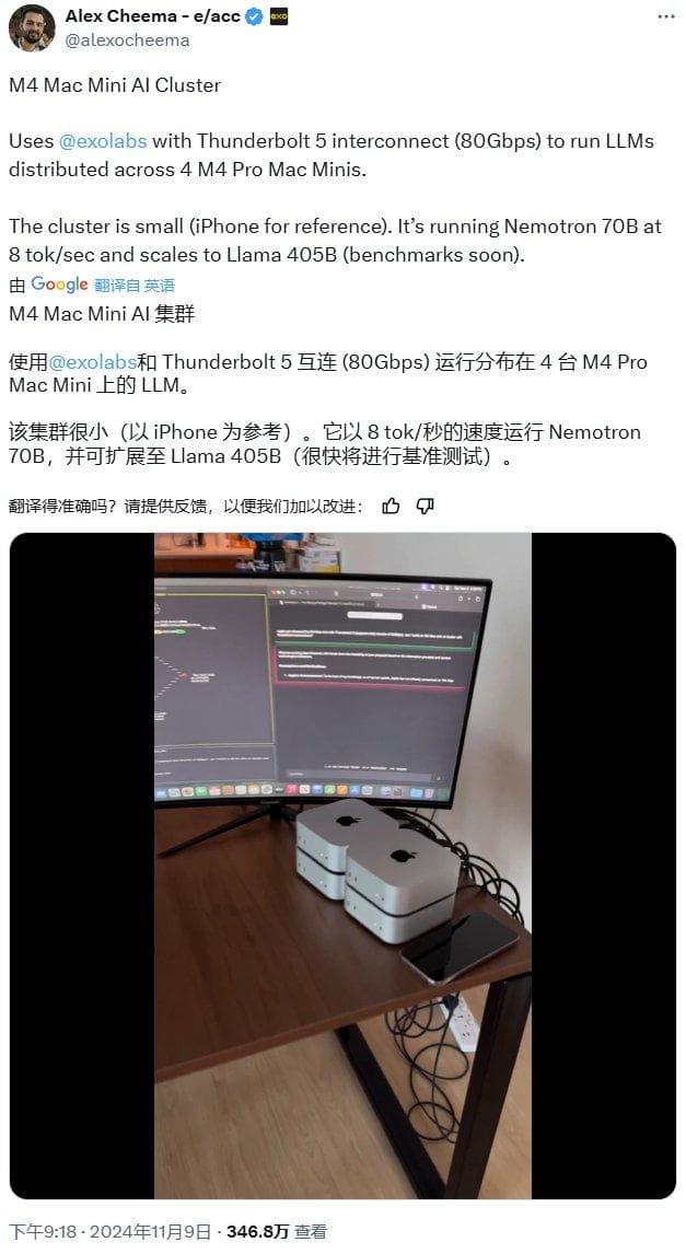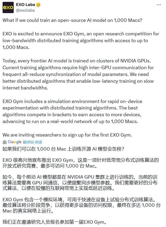 其实,上图中的这位 Alex Cheema 不仅仅是在 Mac Mini 上运行自己的个人 LLM 集群,也是在为自家公司 EXO Labs 做概念验证。其在今年初宣布推出了 EXO Gym 竞赛,开始测试能否在较慢的互联网带宽上实现有效的低延迟训练,而他们为此准备的 Mac Mini 数量更是多达 1000 台!是的,你没有看错,不只是使用 Mac Mini 来执行推理,还使用它们来训练模型。