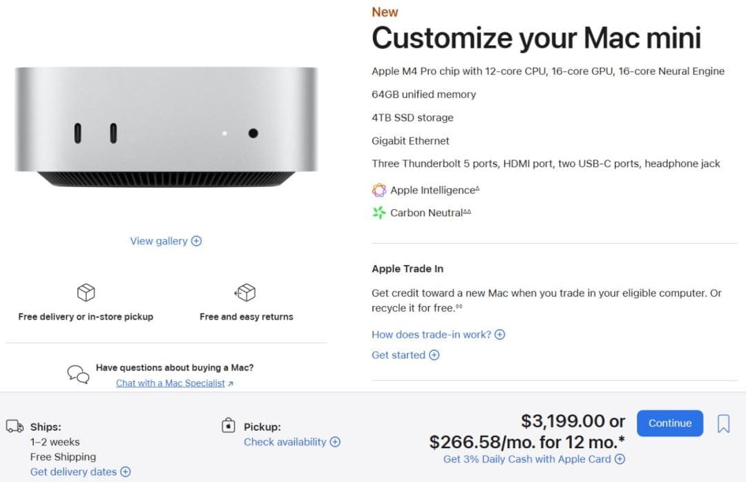 配备 12 核 CPU、16 核 GPU 和 16 核 Neural Engine 的 M4 Pro 芯片的 Mac Mini,当选择 64GB 内存和 4TB 硬盘时,售价为 3199 美元