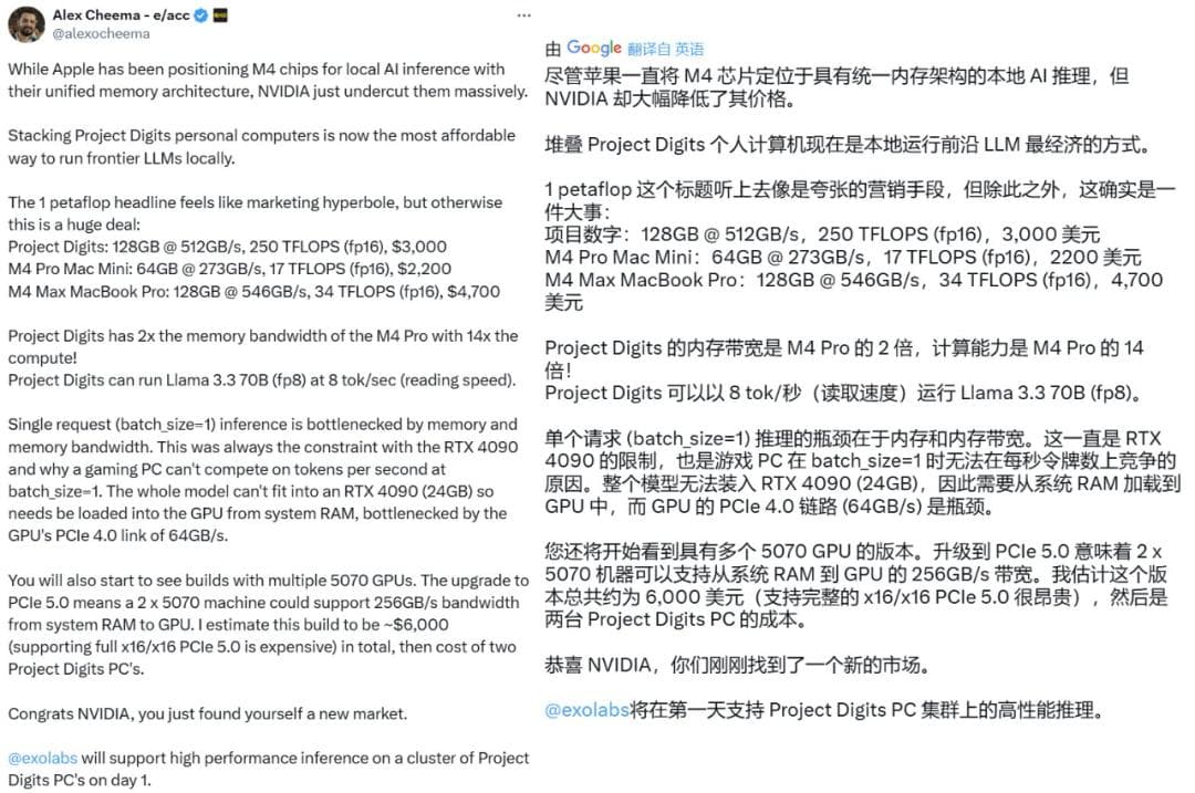 根据 Alex Cheema 的计算,Project DIGITS 可以说在各个层面都碾压了 M4 Pro Mac Mini。