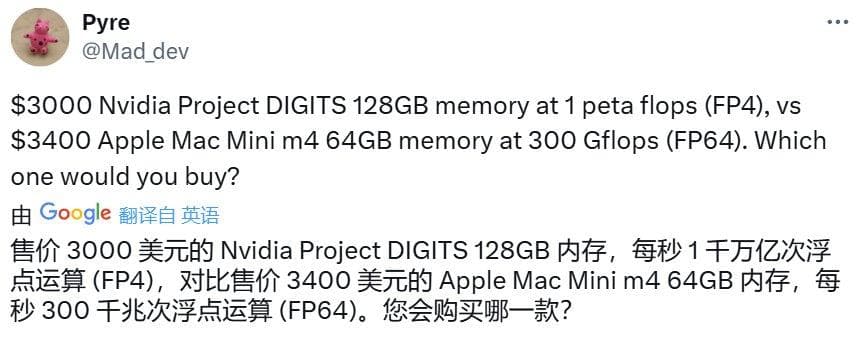 也就是说,用同样的钱,能从 Project DIGITS 获得超过 M4 Pro Mac Mini 超过 10 倍的算力!