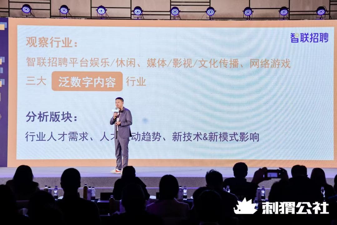 我们今天是一个跟数字内容产业相关的大会,智联招聘把数字内容相关的行业,大概分成了三个大类,包括娱乐休闲、媒体影视/文化传播和网络游戏。我们把网络游戏也放进来了,因为网络游戏的推广发生了非常巨大的变化,需要很多的内容从业者加入进来。