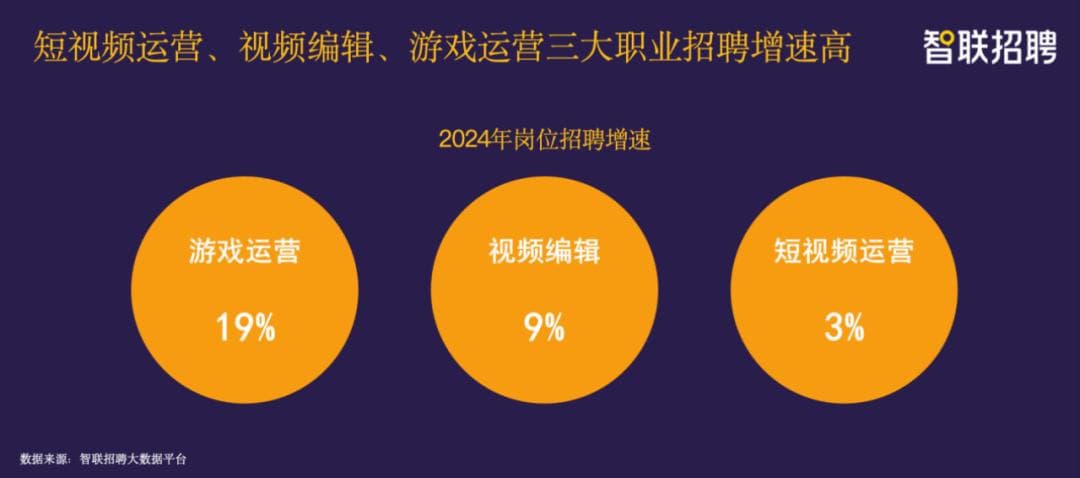 有三个职位的增速很高,第一个是游戏运营,第二个是视频编辑,第三个是短视频的运营。