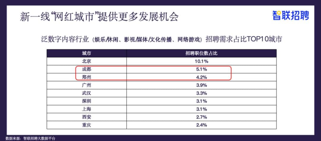 尤其这几年,成都等二线城市出台了一系列的政策来吸引数字内容行业的人。所以大家可以看一下,我们会发现有很多生活和事业都能兼顾的城市正在跑得越来越快。
