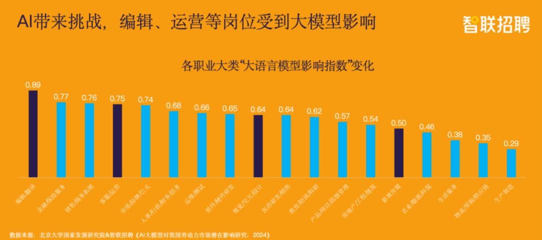 内容行业里面,好多人也是从事和编辑相关的工作。细分领域里,跟记者相关的、新闻相关的,甚至与公众号相关的、视频剪辑相关的岗位,我们认为都是受大模型影响很大的。不代表工种会完全消失,只是招聘需求会变得越来越少。