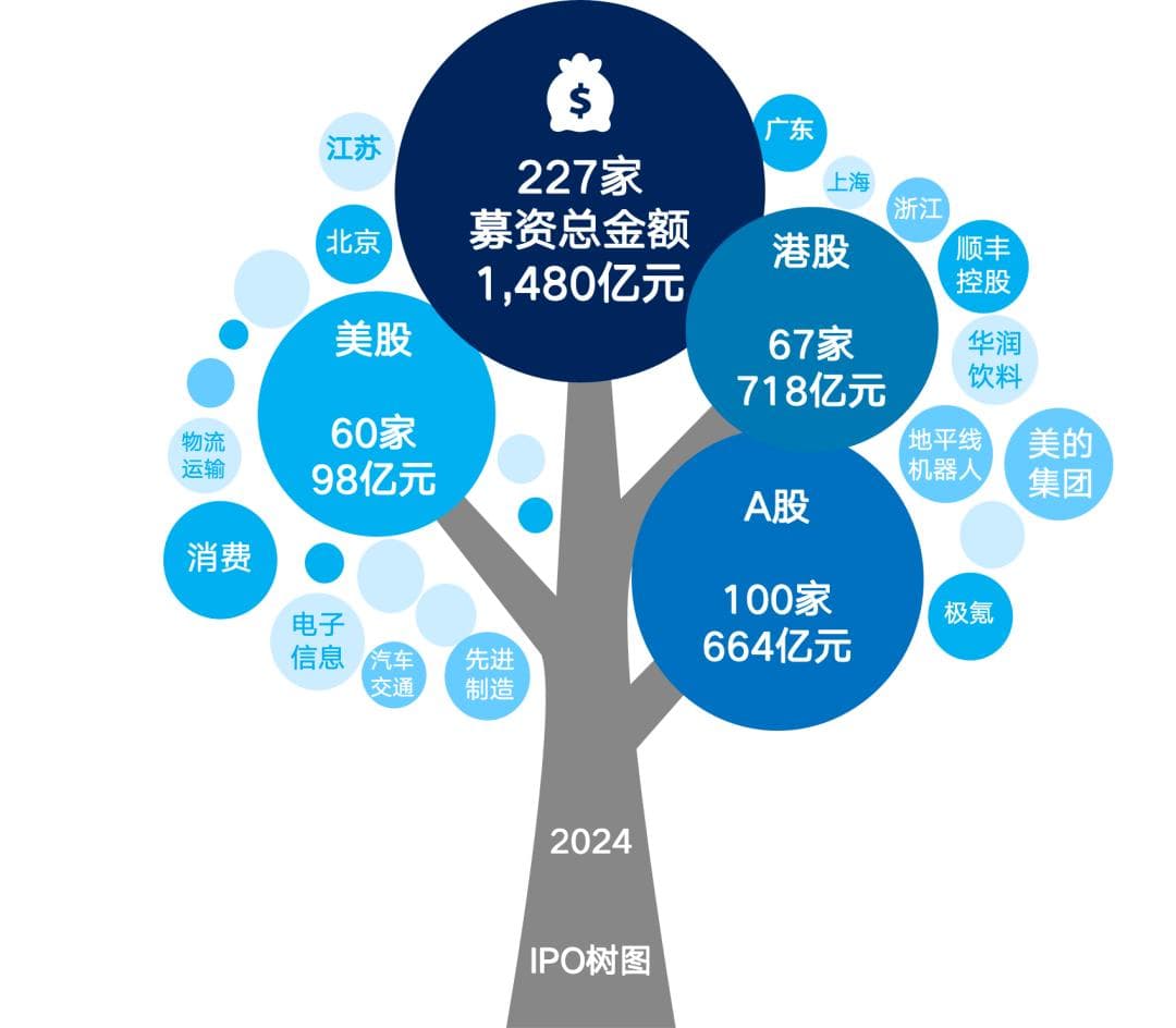 2024年,共227家中国企业在A股、港股以及美股成功IPO,募资总金额1,480亿元;IPO募资金额TOP5企业依次为美的集团、顺丰控股、地平线机器人、华润饮料、极氪;IPO集中行业为消费、电子信息、先进制造、汽车交通、物流运输;IPO集中地域为广东、浙江、北京、江苏、上海。