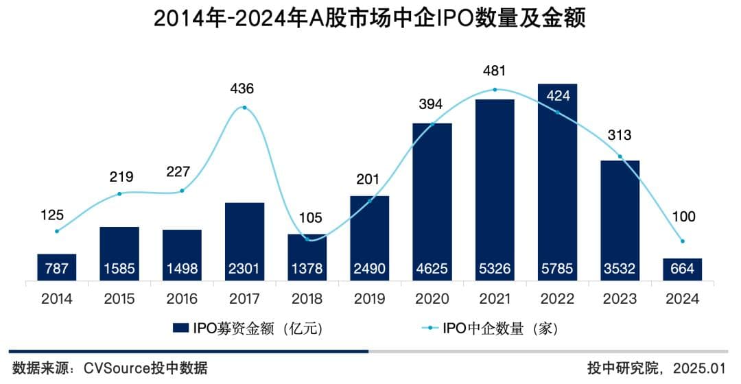 图8 2014年-2024年A股市场中企IPO数量及金额