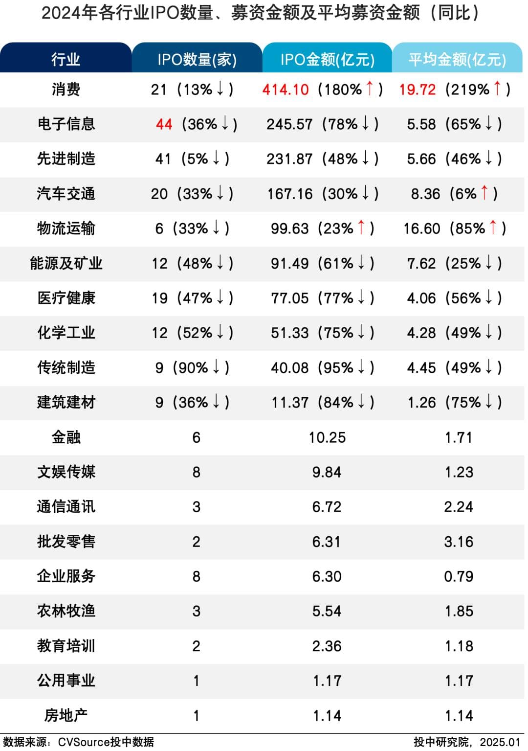 表12 2024年各行业IPO数量、募资金额及平均募资金额(同比)
