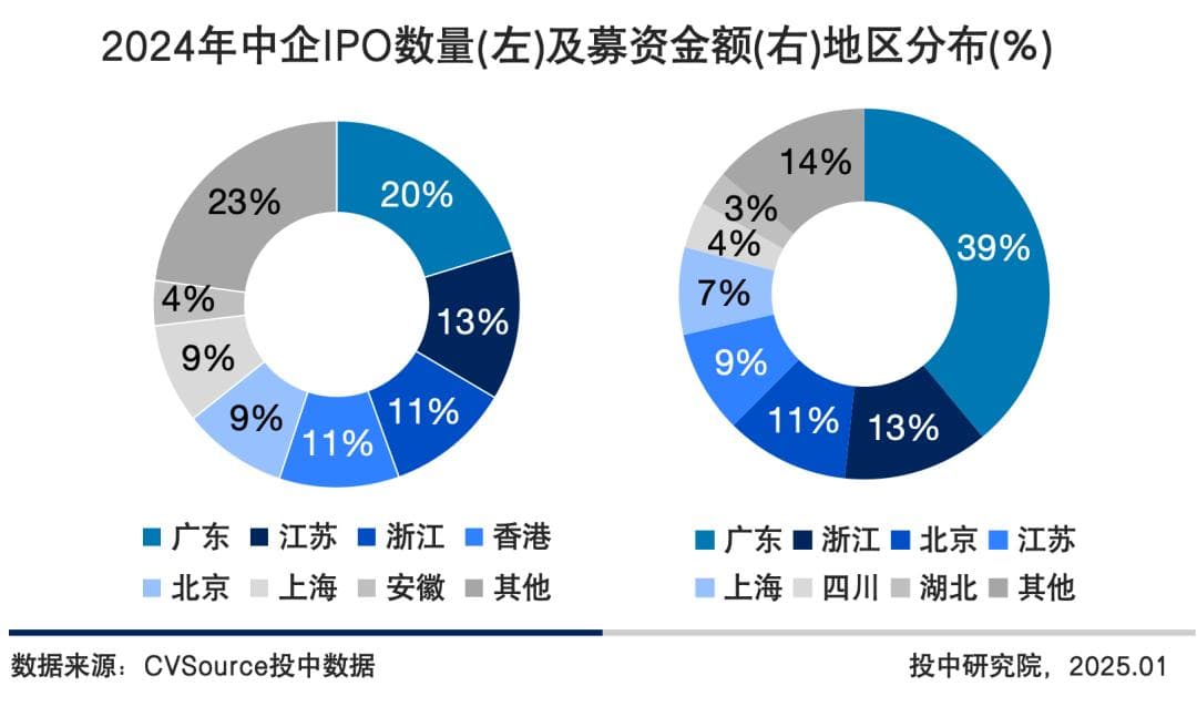 图15 2024年中企IPO数量(左)及募资金额(右)地区分布(%)