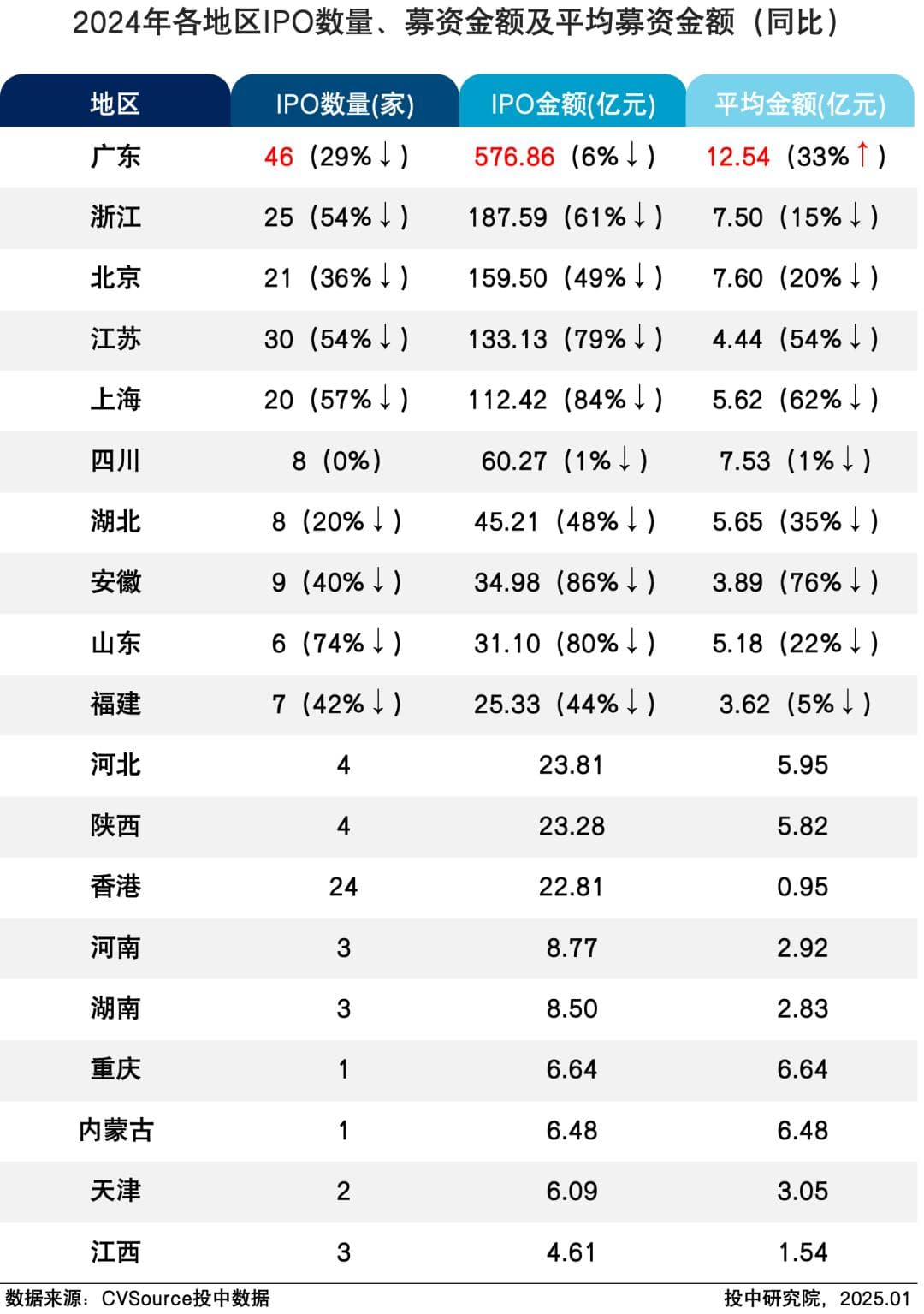 2024年,广东地区IPO数量为46家、IPO募资金额为577亿元、项目平均募资金额为12.54亿元,三项均位于首位。