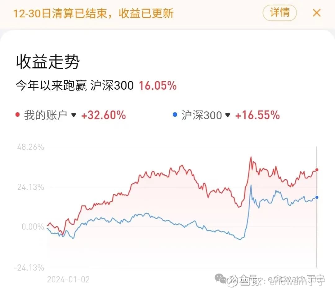 正是凭借着定量分析,2016~2019年,牛市居多,我的年化收益20%左右。2020~2023年,熊市居多,我的年化收益15%左右。2024年股市还行,我也略微超越大盘,获得了32%的投资收益!