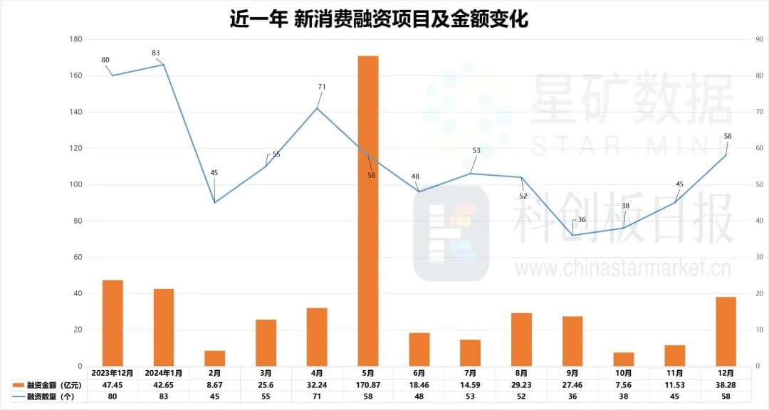 财联社创投通数据显示,2024年12月国内消费相关领域披露融资事件58起,同比下降27.5%,环比上升28.9%;据已披露的投融资金额显示,12月消费相关领域累计融资38.28亿元,同比下降19.6%,环比增幅达232%。