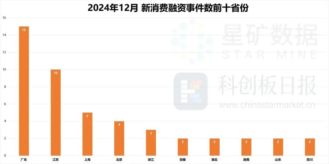 江苏同样是12月资本投资的“香饽饽”,共有10起投融资事件。上海较11月投融资事件减少,共有5家新消费类企业获投。