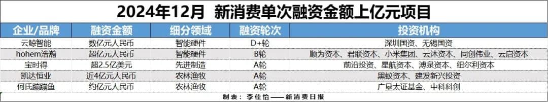 12月消费领域投融资有所回暖,获投金额上亿元的项目共有4起,大都处于早期融资(以A轮、B轮为主),分别为专注AI智能影像设备的“hohem浩瀚”、生成家用电动工具的“宝时得”和休闲食品研发商“凯达恒业”,仅有主攻智能硬件赛道的“云鲸智能”为中后期融资。