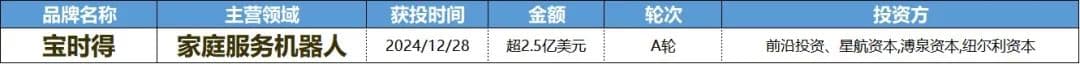 此外,本地生活领域的企业也获投较多,录得8起,主要为股权融资事件。除此之外,还有3家企业完成A轮融资。其中,专注家庭服务机器人赛道的宝时得,获得前沿投资、星航资本、溥泉资本、纽尔利资本投资超2.5亿美元,成为12月融资最多的消费类企业。