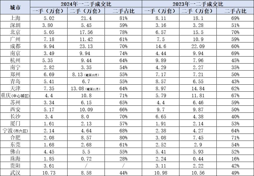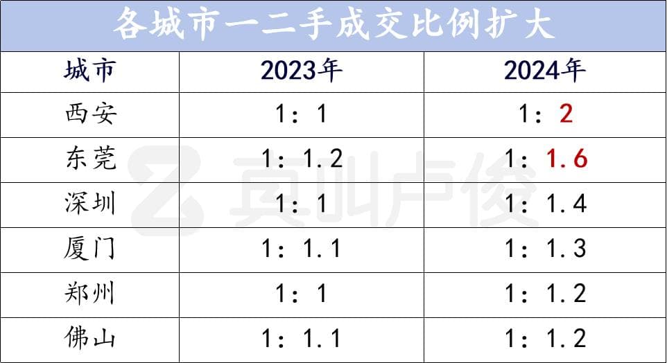 比如西安、深圳、郑州等 6个城市原本就是存量市场为主, 2023年一二手成交也是五五开的样子,结果去年二手成交就和一手彻底拉开了差距。