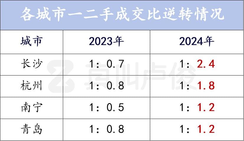 2023年长沙 一二手成交比例为1: 0.7,这个时候整体还是一手主导的,二手成交量市占仅不到40%,但经过一年发力,2024年二手房已经抢占了70%的市场,一二手成交比来到1:2.4,也是这次统计下来二手反转最厉害的一个城市。