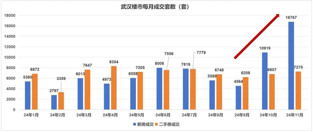 当然也有一类特殊情况,就是二手成交占比反而降了下来,比如武汉,这个曾经一手库存特别高的城市,去化周期特别长最高逼近35个月,非常吓人的概念,房价一度跌得惨不忍睹,这个城市如今所有注意力、资源和钱都放在了去新房库存上,所以能明显看到新房成交几乎是跳涨。目前去库存的成绩还是优秀的,楼市也开始走向健康状态。