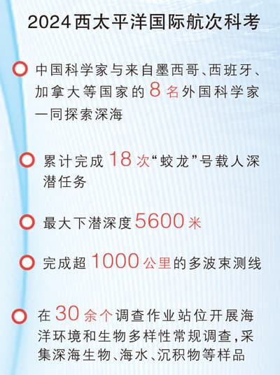 2024西太平洋国际航次科考由自然资源部中国大洋事务管理局统筹国家深海基地管理中心组织实施,是“数字化深海典型生境”大科学计划下,首个在公海区域开展的联合科考,也是首次有外国科学家搭乘“蛟龙”号开展深海科考。