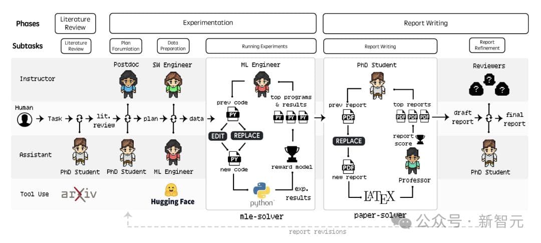 由LLM驱动的专业智能体(如博士、博士后等)协同工作,承担文献综述、实验规划、数据准备和结果解释等工作。这些智能体还会集成arXiv、Hugging Face、Python和LaTeX等外部工具,来优化结果。