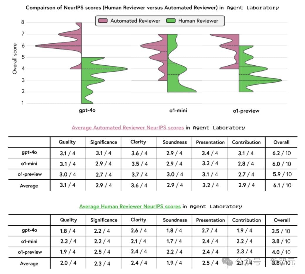 通过比较15篇由10位博士审阅的论文,研究者分析了3个LLM(gpt-4o、o1-mini、o1-preview)在实验质量、报告质量和实用性方面的表现。人类评审者使用NeurIPS风格的标准来评估论文。