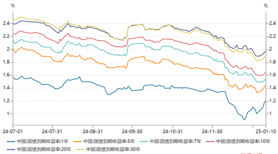 上周利率债收益率上行,短端上行较多。截至1月10日收盘,1Y、5Y、7Y国债分别报收1.19%、1.42%、1.54%,分别较前一周收盘变动19BP、9BP、4BP;10Y、20Y、30Y国债分别报收1.64%、1.96%、1.88%,分别较上周收盘变动4BP、6BP、6BP。