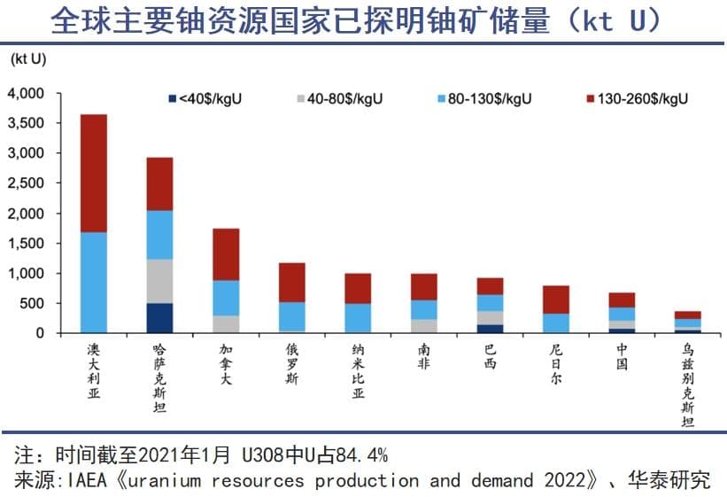 据IAEA(国际原子能机构)统计,全球已探明的铀矿储量为607.85万吨,总体并不算特别稀缺。但其开采成本高昂,开采成本低于80美元/kg的仅占16.5%,低于40美元开采成本以下的铀资源仅可使用10年左右。