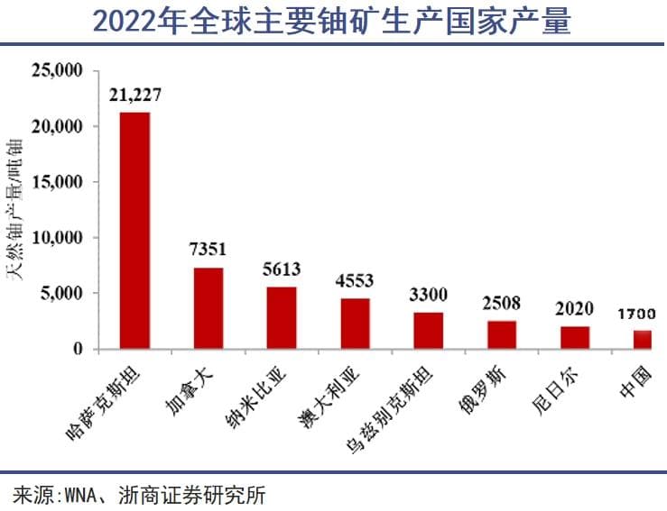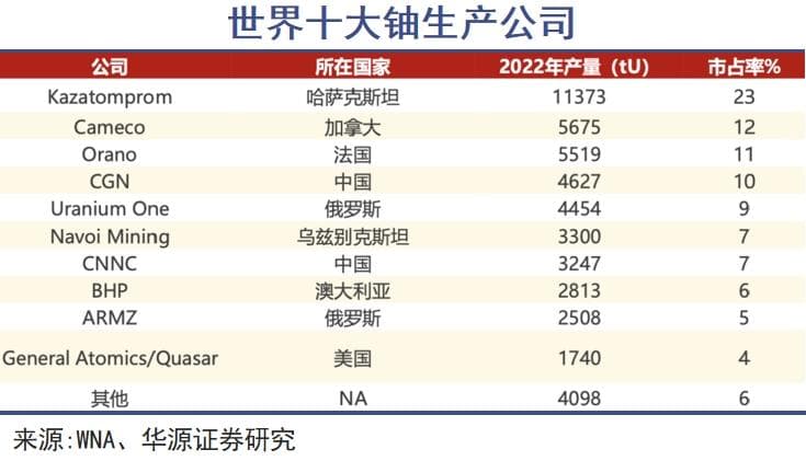 与此同时,铀矿全球分布不均匀,澳大利亚、哈萨克斯坦、加拿大、俄罗斯和纳米比亚五国占据了近七成的份额。而其中,由于开采成本最低,哈萨克斯成为全球铀矿产出第一大国。
