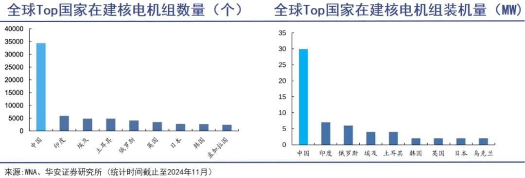 增量方面,截至2024年11月末,全球在建的66个核电机组中,有近一半(30个)位于中国,在建机组数量占全球45.5%,在建装机容量高达34377兆瓦,占比47.9%,无论是数量还是装机量均高居世界第一。