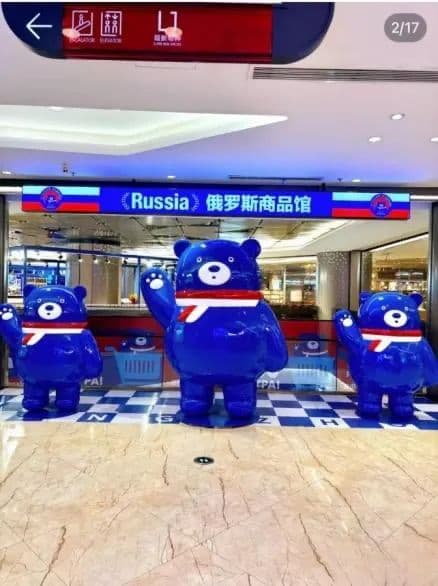 门面几乎都有“俄罗斯蓝熊”,不论是画在招牌里、墙面上,还是立在门口的大型雕塑,这个“巨熊”吉祥物都在亲切地挥舞着熊掌欢迎路人(韭菜,bushi)进店。