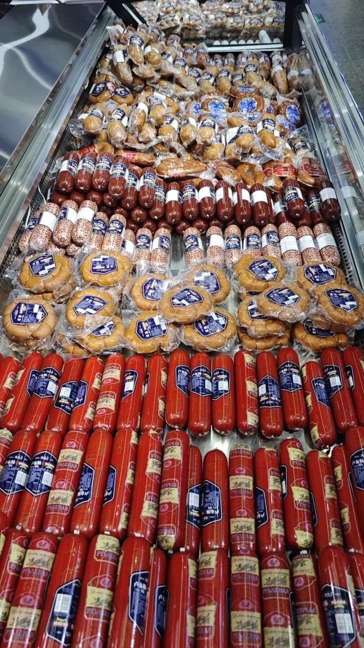 除了大列巴,还有个重量级选手就是香肠。几冰柜香肠一个个小臂那么粗,有序铺开得像“红肠阅兵”,散发出醇厚的“肉感”。