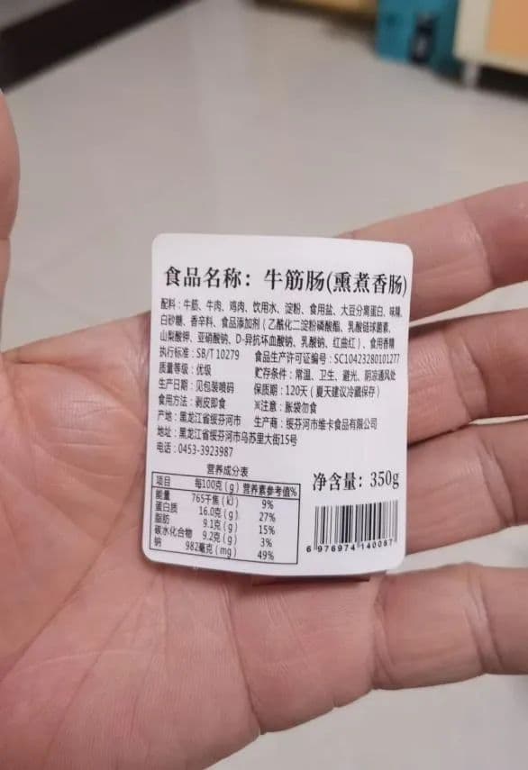 香肠可能来自黑龙江绥芬河,也可能来自河北沧州,甚至是浙江金华。还有产自福建的果汁软糖,产自广东的牛筋肠.......产地一路向南,越看心越凉。