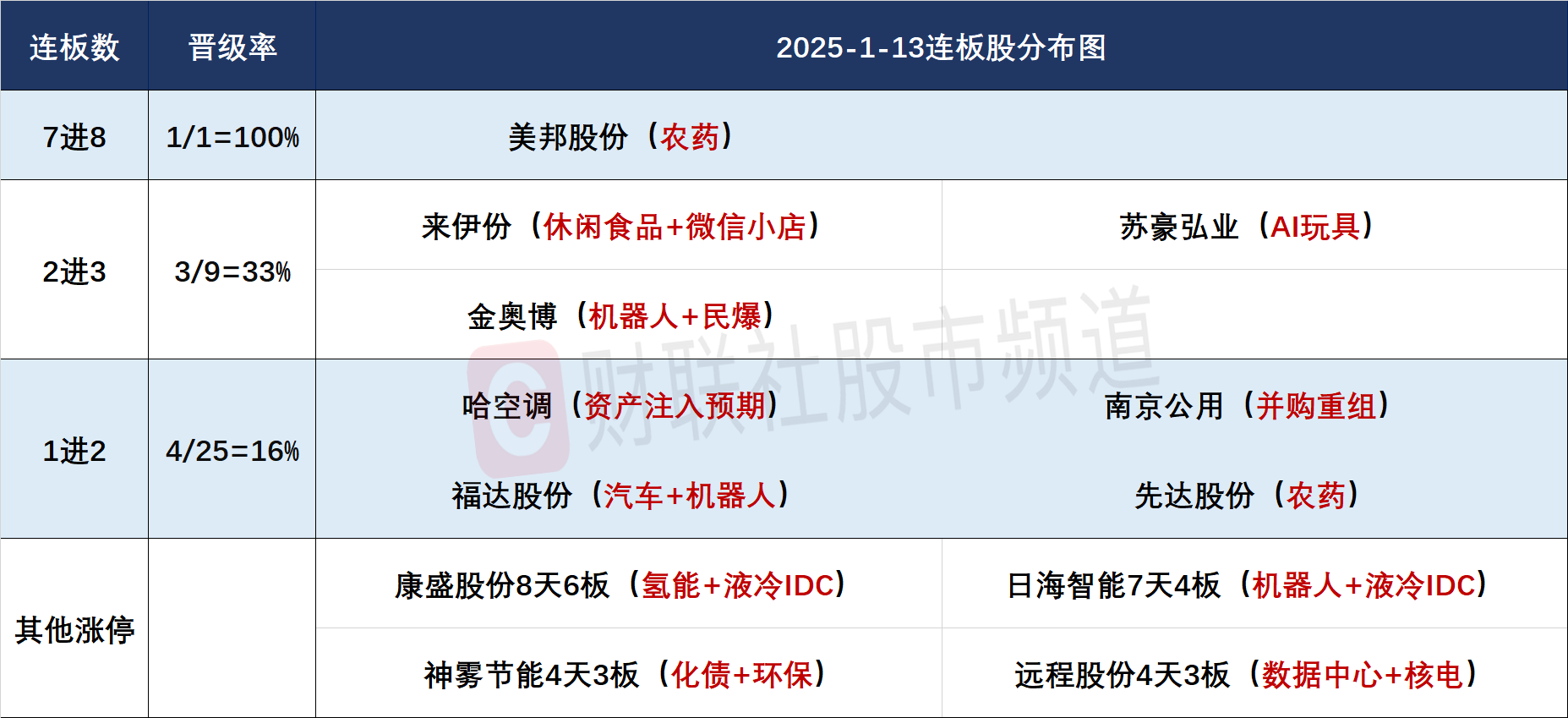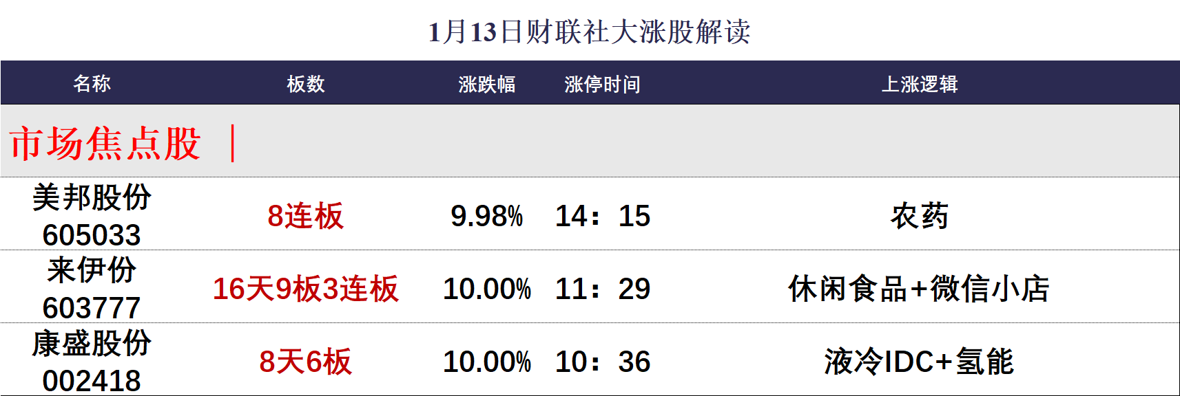 财联社1月13日讯,今日45股涨停,18股炸板,封板率为71%,美邦股份8连板,苏豪弘业、来伊份、金奥博3连板,康盛股份8天6板,日海智能7天4板,远程股份、神雾节能4天3板。市场全天震荡分化,三大指数涨跌不一。沪深两市全天成交额9664亿,较上个交易日缩量1819亿,自去年9月25日以来成交额首次跌破万亿。盘面上,热点较为杂乱,个股涨多跌少,全市场超3000只个股上涨。板块方面,油气、光刻机、有色金属、软件开发等板块涨幅居前,家电、电商、银行、电网设备等板块跌幅居前。截至收盘,沪指跌0.24%,深成指涨0.00%,创业板指涨0.36%。