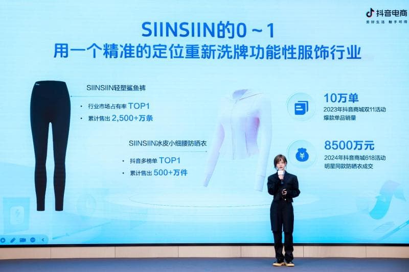 大盘的增长催生了不少表现亮眼的品牌。2021年成立的SIINSIIN,2022年时的年销售额还在3亿左右,到去年,仅双11大促期间的整体营收就达到了3.2个亿。截至去年8月,SIINSIIN一共卖出了2500万条鲨鱼裤,相当于日销2.2万条。2023年成立的MissWiss,上线不到一年就在抖音单渠道实现了超15亿元的业绩,全平台一年卖出了1300万条鲨鱼裤。做一个对比,MAIA ACTIVE已经是本土业绩和品牌建设最好的女性运动品牌,但它也是勤勤恳恳做到第七年,才有了5亿的年销售额。
