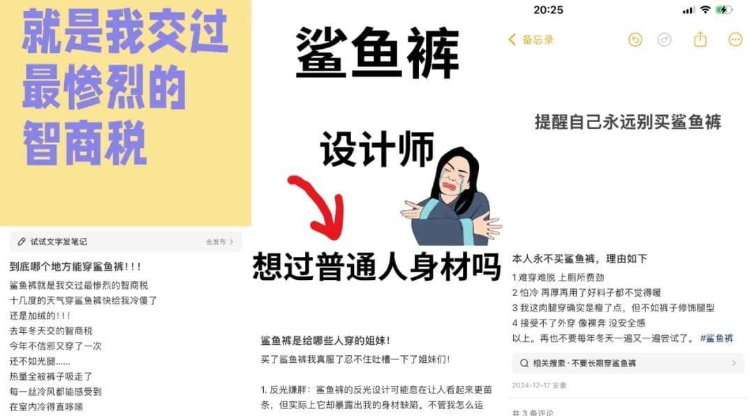 还有一个问题来自鲨鱼裤这个产品本身。一位消费者告诉我们,她购买的某头部品牌鲨鱼裤,并没有短视频广告中看到的穿着那么舒适,穿久了反而勒腰腹。而在社交网络上,也有不少人对鲨鱼裤到底是否保暖、是否适合普通人的身材、是否真的方便穿脱表示了怀疑。