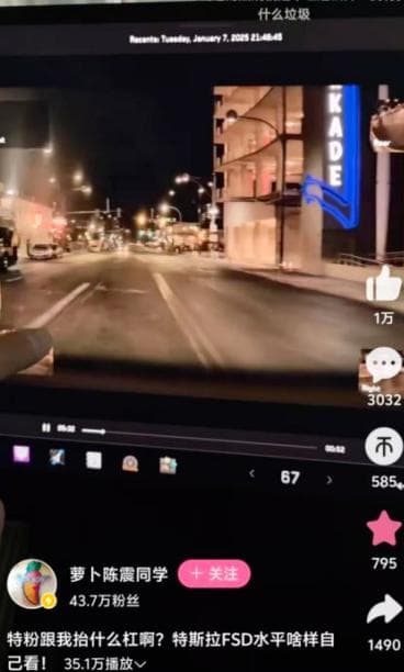 5、逆行与违规变道:在微博KOL陈震的美国FSD试驾视频中,特斯拉FSD在左转通过路口后会走错车道甚至“逆行”。此外,为了寻找更快路线,特斯拉FSD有时会选择直接越过双黄实线,这一点无论是在美国还是在中国都不符合交规,极易引发交通事故。