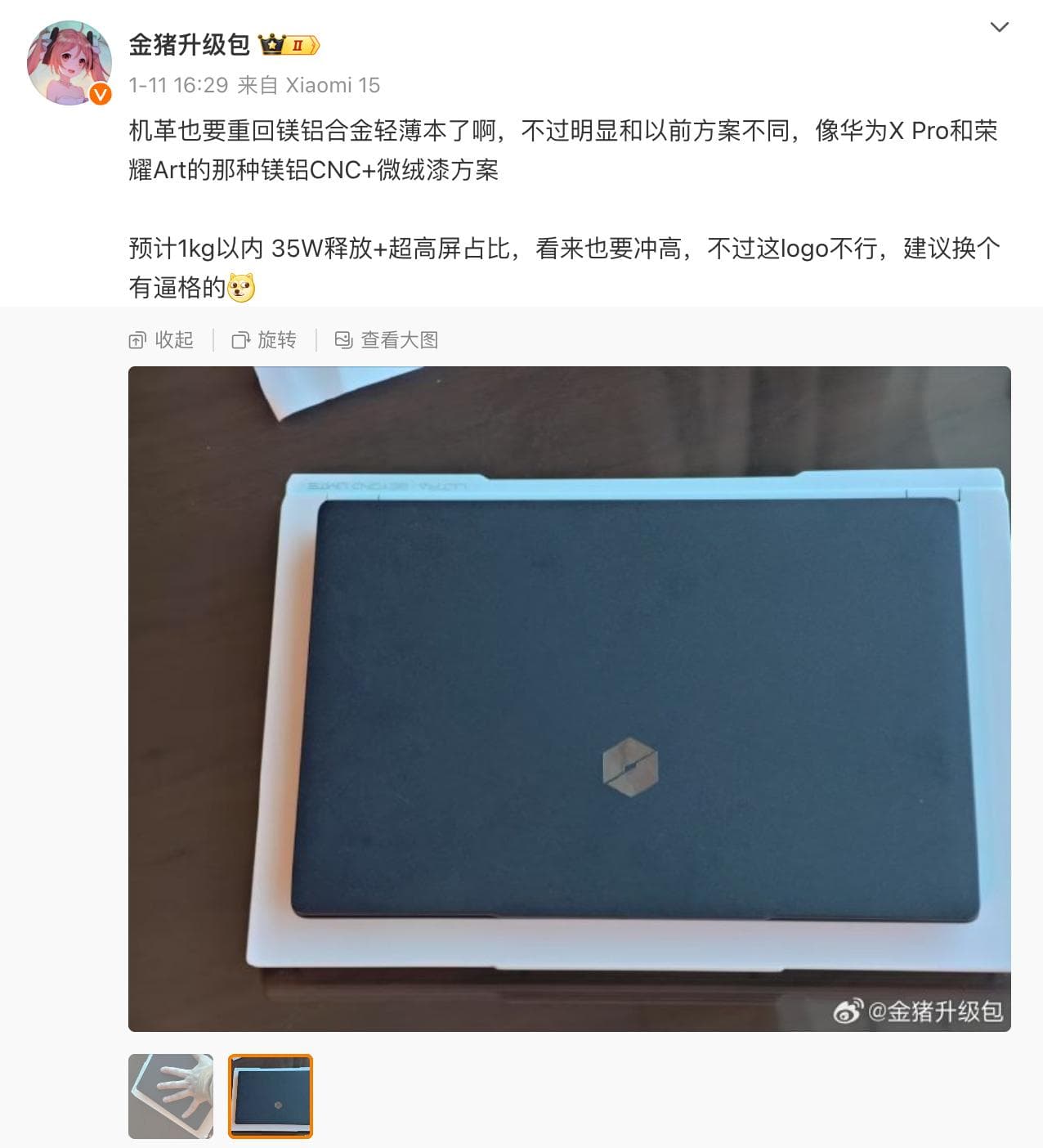 甚至在 2024 年异军突起的二线厂商机械革命,也不局限于性价比游戏本和轻薄本了,将推出一款主打超轻的高端笔记本产品。最近,知名 PC 博主@金猪升级包就在微博透露,机械革命也要推出一款 1kg 以内重量的超轻笔记本,重回超轻本的行列。