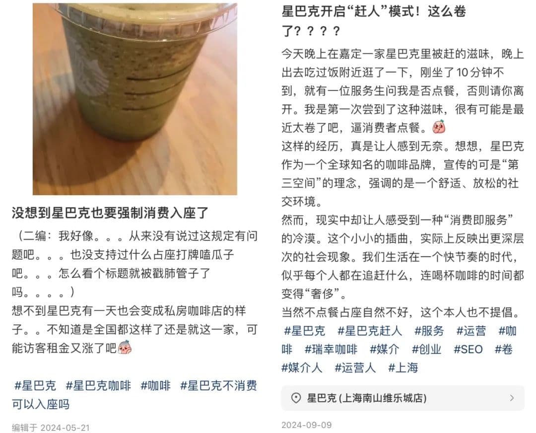 小食代注意到,尽管新规未在星巴克中国门店对外官宣推行,但也有一些消费者提及,去年以来他们曾在星巴克中国门店时,就曾经遇过“变相提醒消费”的情况:比如,有的表示店员会直接询问是否要点餐、否则请离开;也有的消费者说,由于把喝完的星巴克咖啡杯子扔垃圾桶了,这让店员忘记他已经消费过,在座位上被语气生硬地提醒再次点餐,导致他体验不佳。