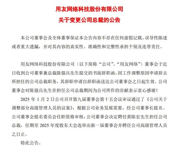 据悉,在陈强兵辞去用友网络总裁一职后,经用友网络董事长王文京提名、公司董事会提名委员会任职资格审核,公司董事会已决定聘任黄陈宏担任公司总裁,任期至2025年度股东大会选举出新一届董事会并聘任公司高级管理人员之日止。