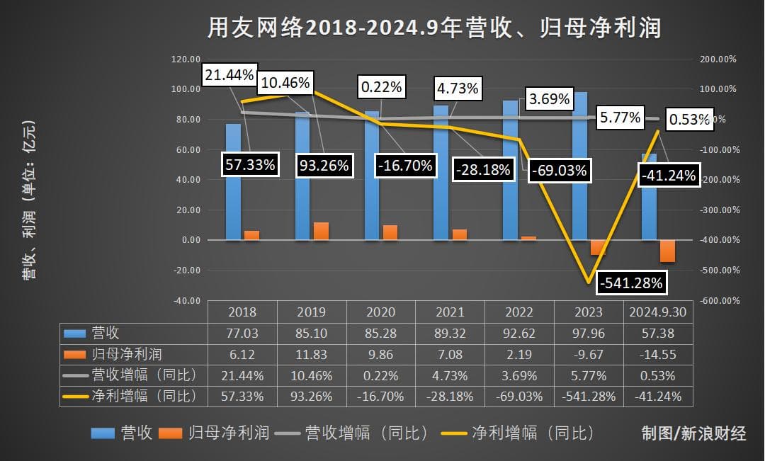 在陈强兵再度担任总裁期间,用友网络的业绩并没有太大起色。2024年前三季度,其归属于母公司的净亏损进一步扩大至14.55亿元,同比下滑41.23%,毛利率也降至48.8%,为2017年以来的最低水平。