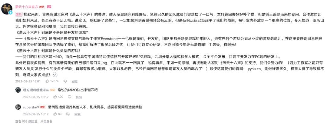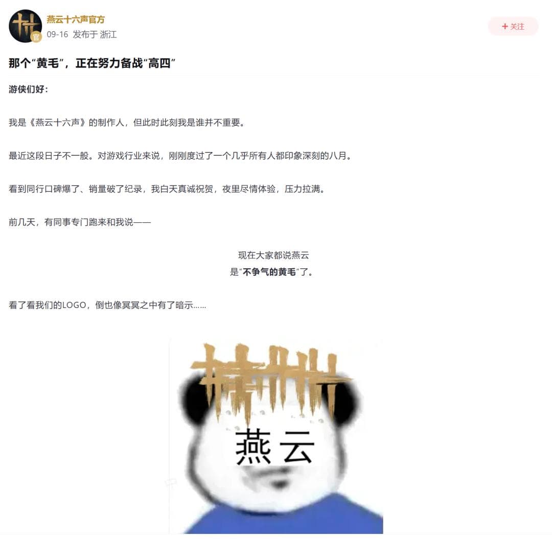 此外,游戏4测前后又赶上《黑神话:悟空》的发售,这让同样宣传“3A”品质的《燕云十六声》在对比之后被戏称为“村里的黄毛”,舆论环境再次下滑,上线将“暴死”的言论开始出现。
