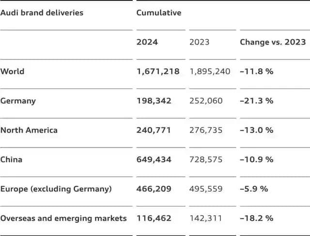 2024年,奥迪全球销量为167.12万辆,同比下降11.8%,包括中国市场在内,奥迪的所有主要市场销量均出现下滑。