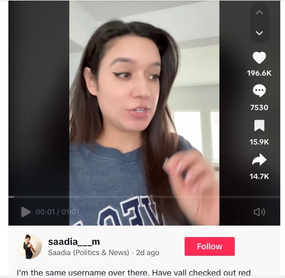 创作者@saadia___m 在TikTok拥有超10万粉丝,她在小红书注册了自己的同名账号,谈到自己来到小红书的原因,她这样表示:“祝贺美国政府玩弄你们自己,当你们坐在这里争论这个应用程序是否应该留在这儿时,你们知道这个应用程序的创建者和用户在做什么吗?没错,我们去了又一个中国人拥有的应用程序。”