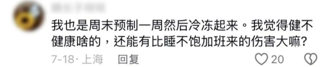 有人关心营养流失的问题:“长期以冷冻饭菜为主,单一饮食结构可能会造成营养素缺失。”