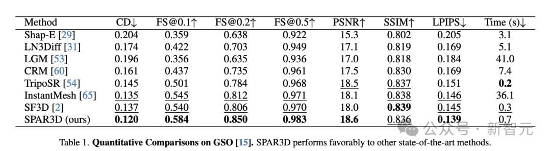在GSO和Omniobject3D数据集上定量比较了SPAR3D与其他基准方法。